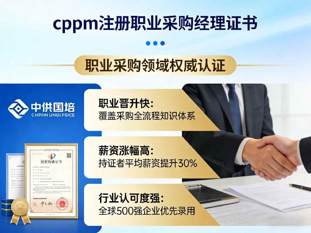 CPPM(注册职业采购经理)是人社部批准认证、纳入国家职业资格认证体系、可在人社部官网查询的国际采购职业资格证书,是国内采购与供应链行业认可度高、适用范围广、企业普遍认可的权威认证。中供国培作为官方授权 CPPM 培训机构,为广大学员提供正规报考、系统培训与一站式取证服务。招生老...